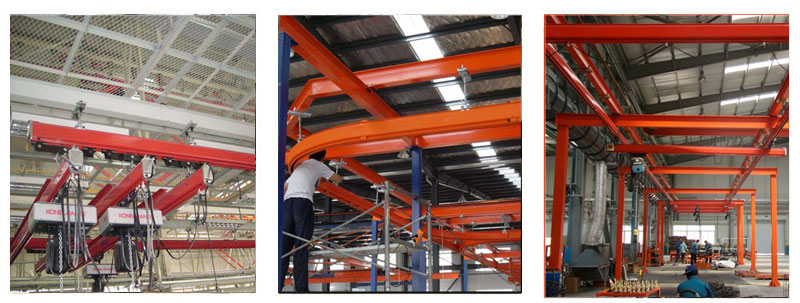 KBK 柔性起重機系統安裝容易,維修方便,各標準模塊之間只須用螺栓連接即可使用。它可以多段對接成單軌直線輸送線,也可以多段對接成兩條平行直線軌道供柔性懸掛起重機做大車運行軌道,還可以一個標準段或兩個標準段平行組合成柔性懸掛起重機主梁。讓您無論是新建還是擴建、改建,都毫不費力。